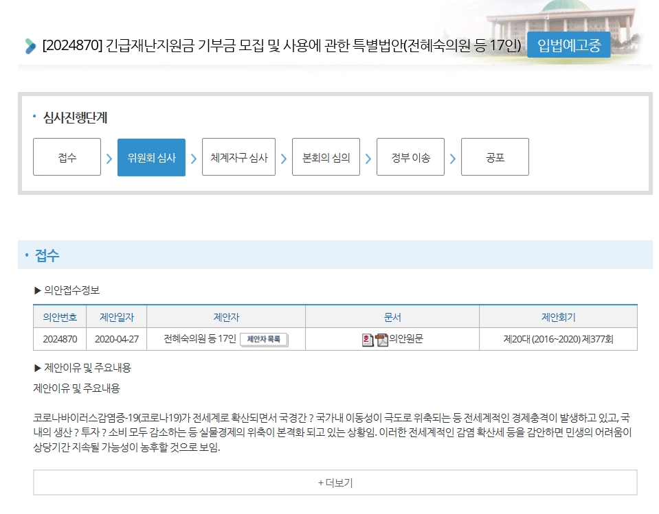 국회 의안정보시스템에 코로나 지원금 기부와 관련한 법안이 올라왔습니다.