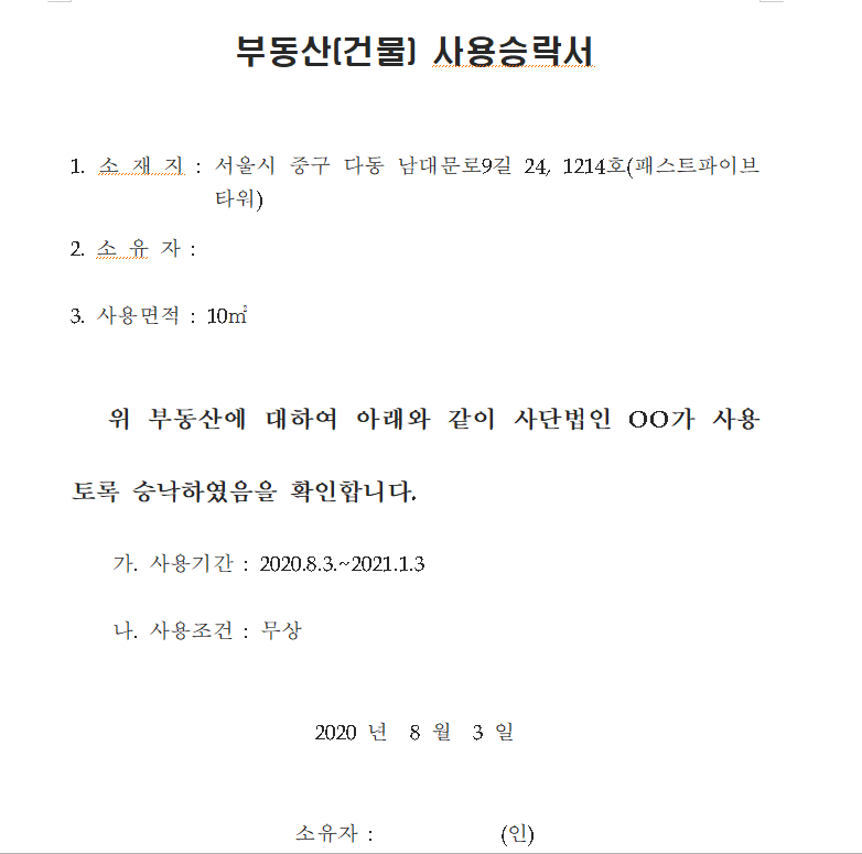 주무관청에서는 부동산[건물] 사용 확인서를 설립신청서류로 요구합니다.