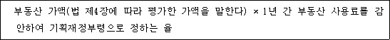 1. 부동산 임대용역의 경우: 부동산가액(법 제4장에 따라 평가한 가액을 말한다) × 1년간 부동산 사용료를 감안하여 기획재정부령으로 정하는 율